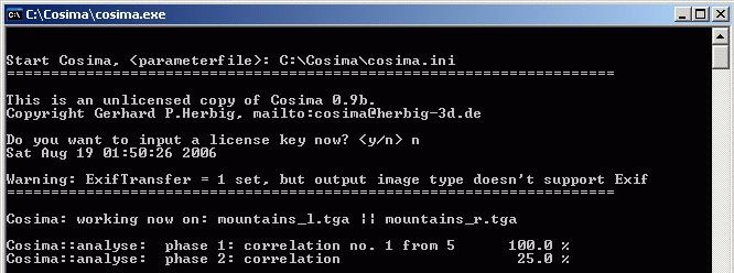 The time Cosima spends on the test images will depend on your computer, on the images and on the settings of the ini-file. All the test images with the preset ini-files should be ready in few minutes for each pair. Press the enter key when Cosima is finished.