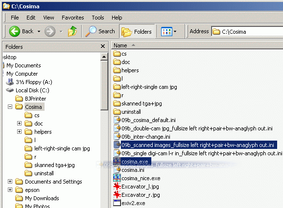 Download the ini-file 09b_scanned images_fullsize left right+pair+bw-anaglyph out.ini". Thendrag and drop this ini-file onto "cosima.exe".