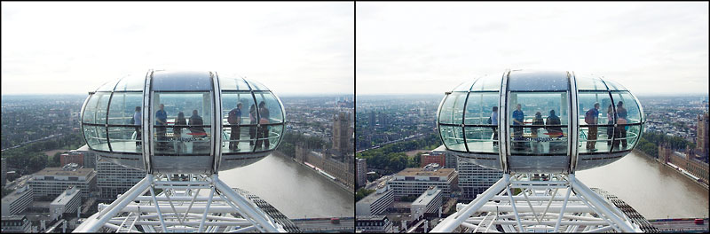 London Eye, two different cameras. Photo by Jan Gjessing and Jørn Lang, "synchronized" by counting. Canon S70 and 10D. Cropped for approximately same contents before mounting.