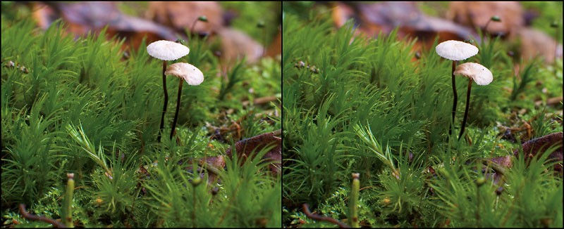 Tiny mushrooms, slidebar. Especially images with low contrast foreground need manual shifting of the images to set the stereo window.